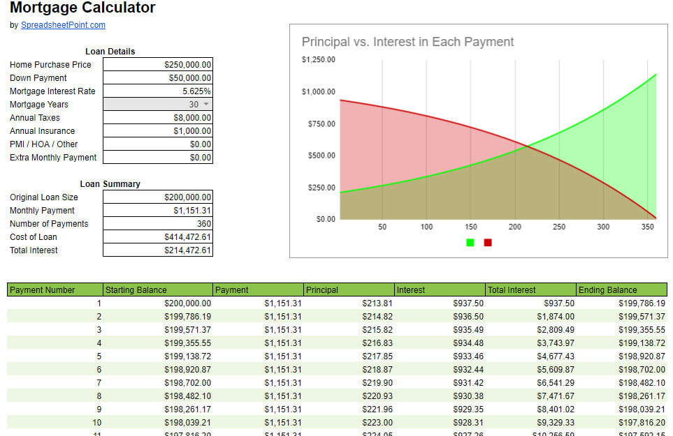 Find out how much you can save over the course of your loan by changing the "extra monthly payment" on our mortgage calculator spreadsheet. This has a full amortization table that updates based on your extra payments.